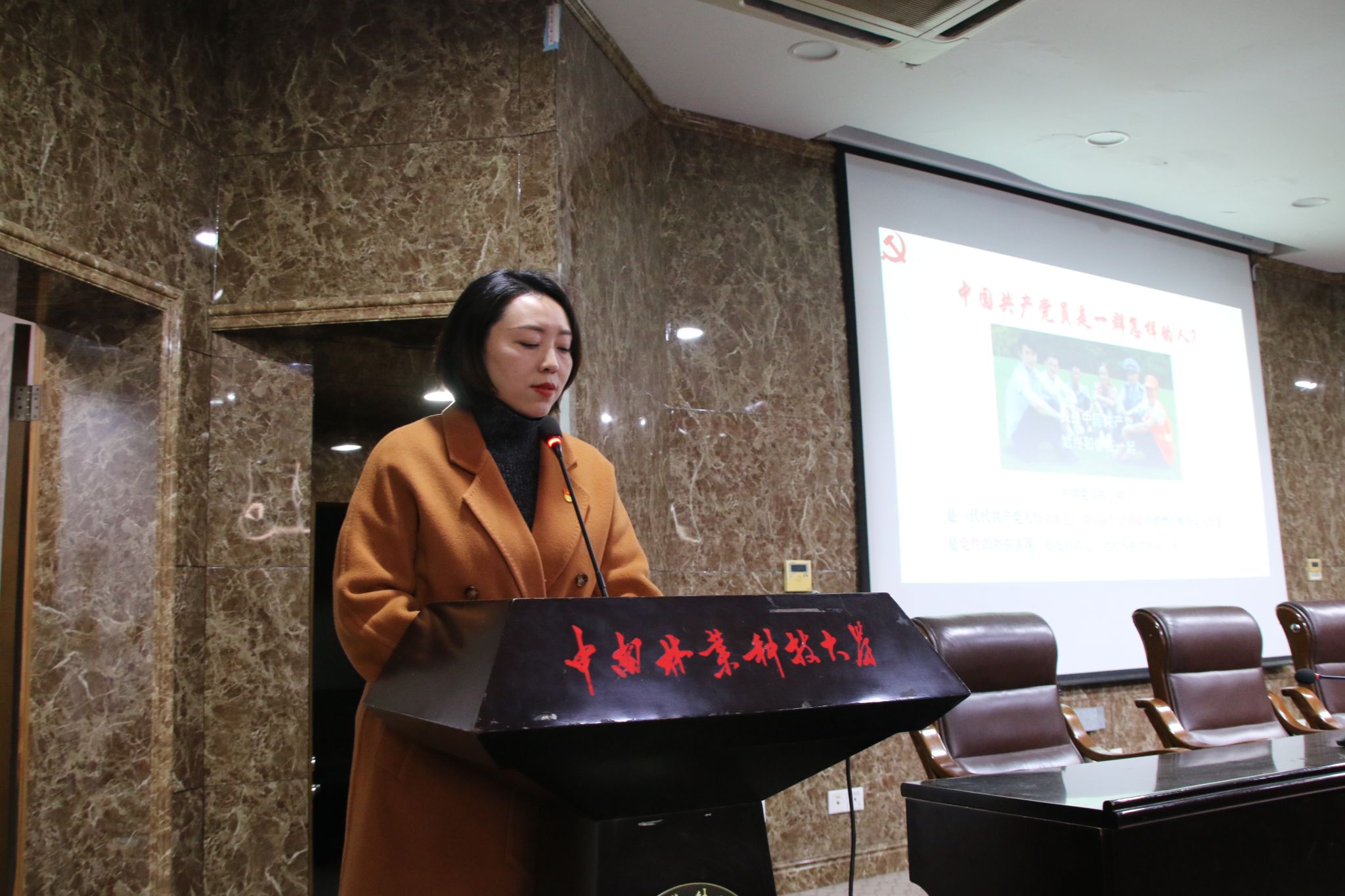 最后,徐钰婷讲授《一段誓词,一生坚守》微党课,从“初心闪耀党性光芒”、“千锤百炼党性修养”、“生逢其时重任在肩”三个方面,勉励青年党员不忘初心牢记使命,并详细介绍了学院党委“培根铸魂”工程的具体举措。