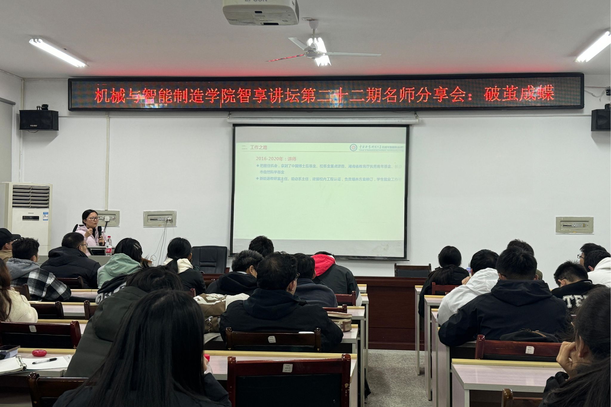 2024年12月6日晚,机械与智能制造学院在逸夫楼333教室举办了以“破茧成蝶”为主题的智享讲坛第二十二期名师分享会,本次分享会的主讲嘉宾为黄丹副教授,工学博士、硕导、全球前2%顶尖科学家。