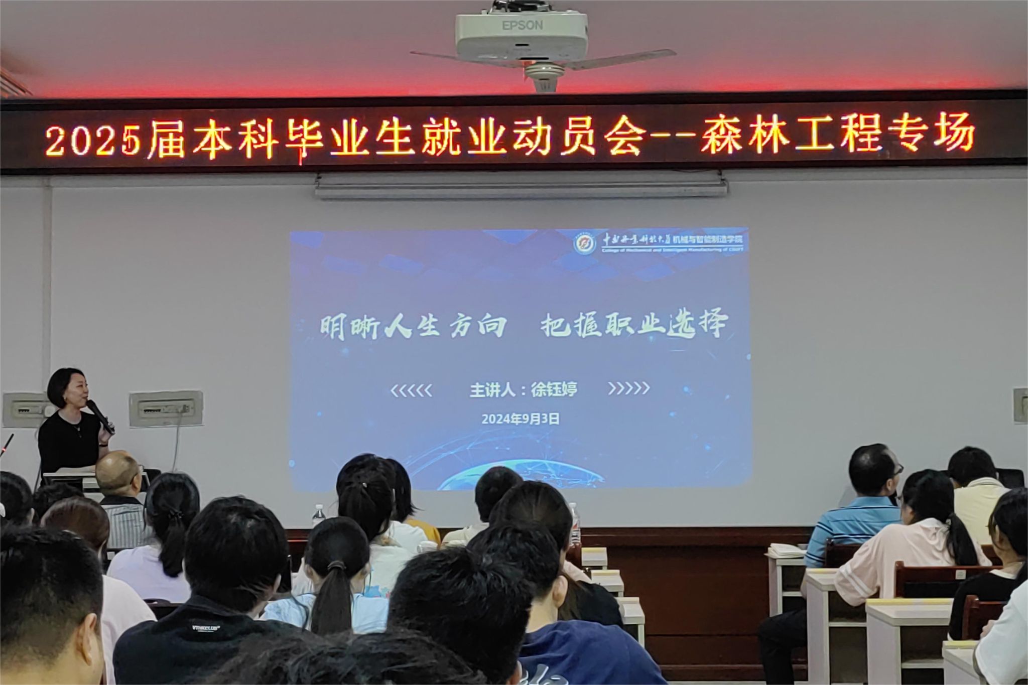 为加快推进2025届森林工程专业毕业生的就业指导工作,给毕业生提供更好的就业指导服务,切实落实就业相关工作,中南林业科技大学机械与智能制造学院于2024年9月3日19:00,在逸夫楼333教室召开2025届本科毕业生就业动员会(森林工程专场)。学院党委副书记徐钰婷、辅导员史俊刚、专业任课老师、已毕业校友参加会议。