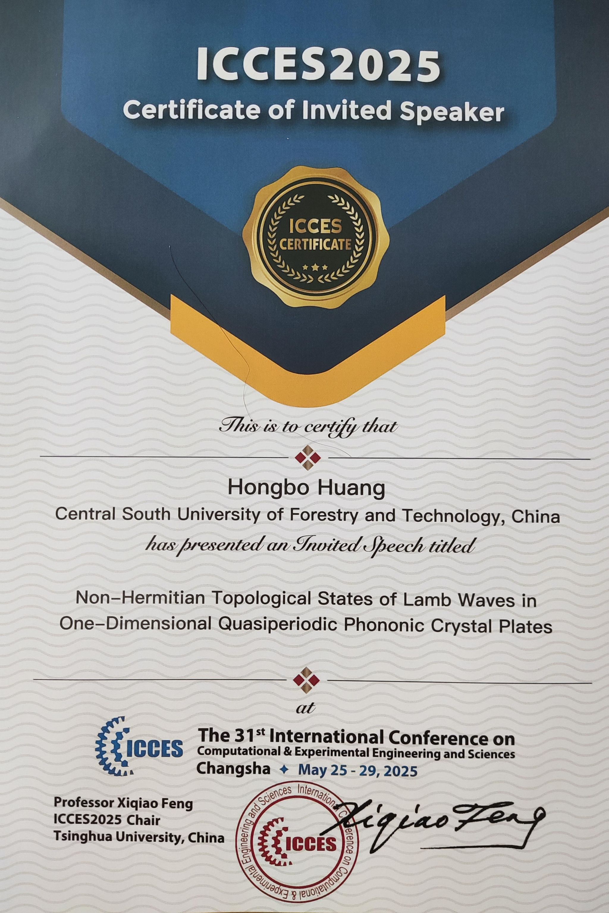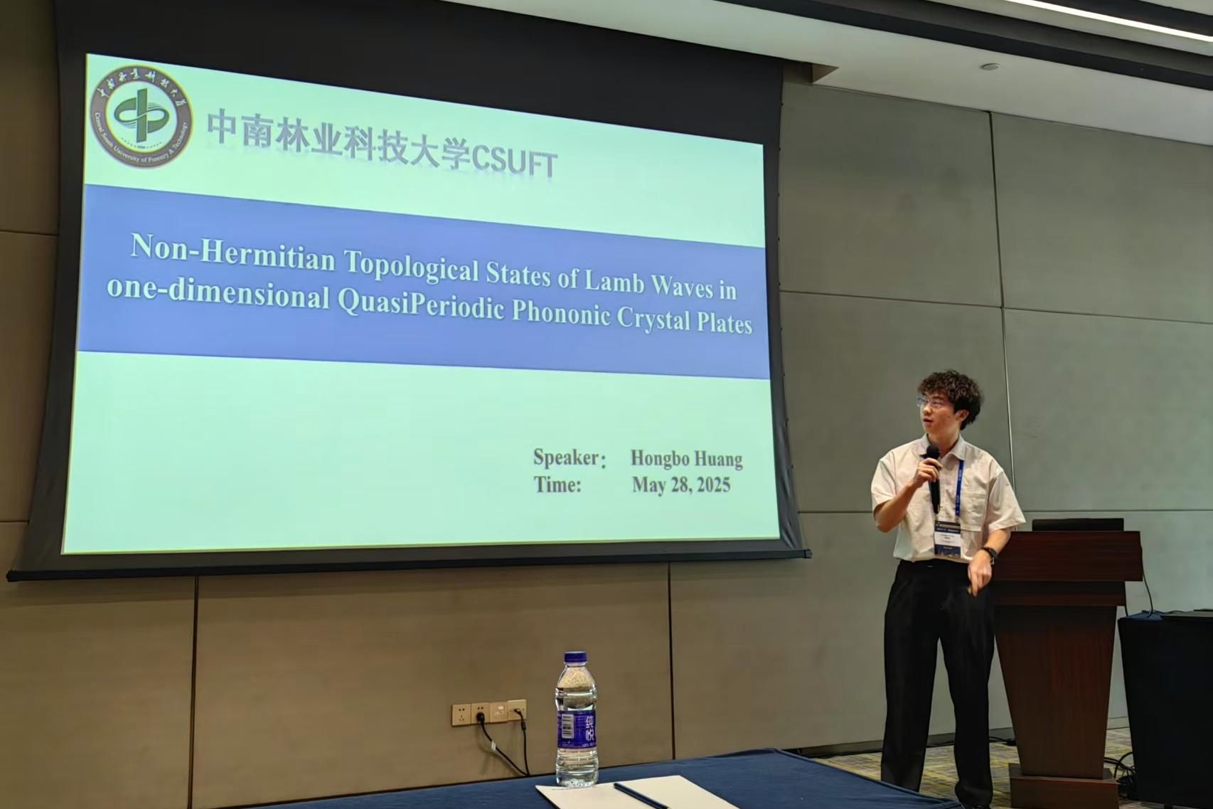 本次大会我院青年教师黄宏波参加会议,并作主题为《Non-Hermitian Topological States of Lamb Waves in one-dimensional QuasiPeriodic Phononic Crystal Plates》(一维准周期声子晶体板中Lamb波的非厄米拓扑态研究)的学术报告。报告介绍了弹性波在非厄米准周期声子晶体中的拓扑态调控技术,实现了多频段拓扑界面态的高效控制,突破了传统周期声子晶体的局限性。这一成果为弹性波能量局域化、高灵敏度传感和智能能量收集等领域提供了新思路。学院始终鼓励青年教师积极参与国际学术交流,提升学科国际影响力。此次报告将进一步推动我院在智能传感等方向的深入研究。学院将持续支持师生投身国际化学术活动,期待更多创新成果走向世界舞台!