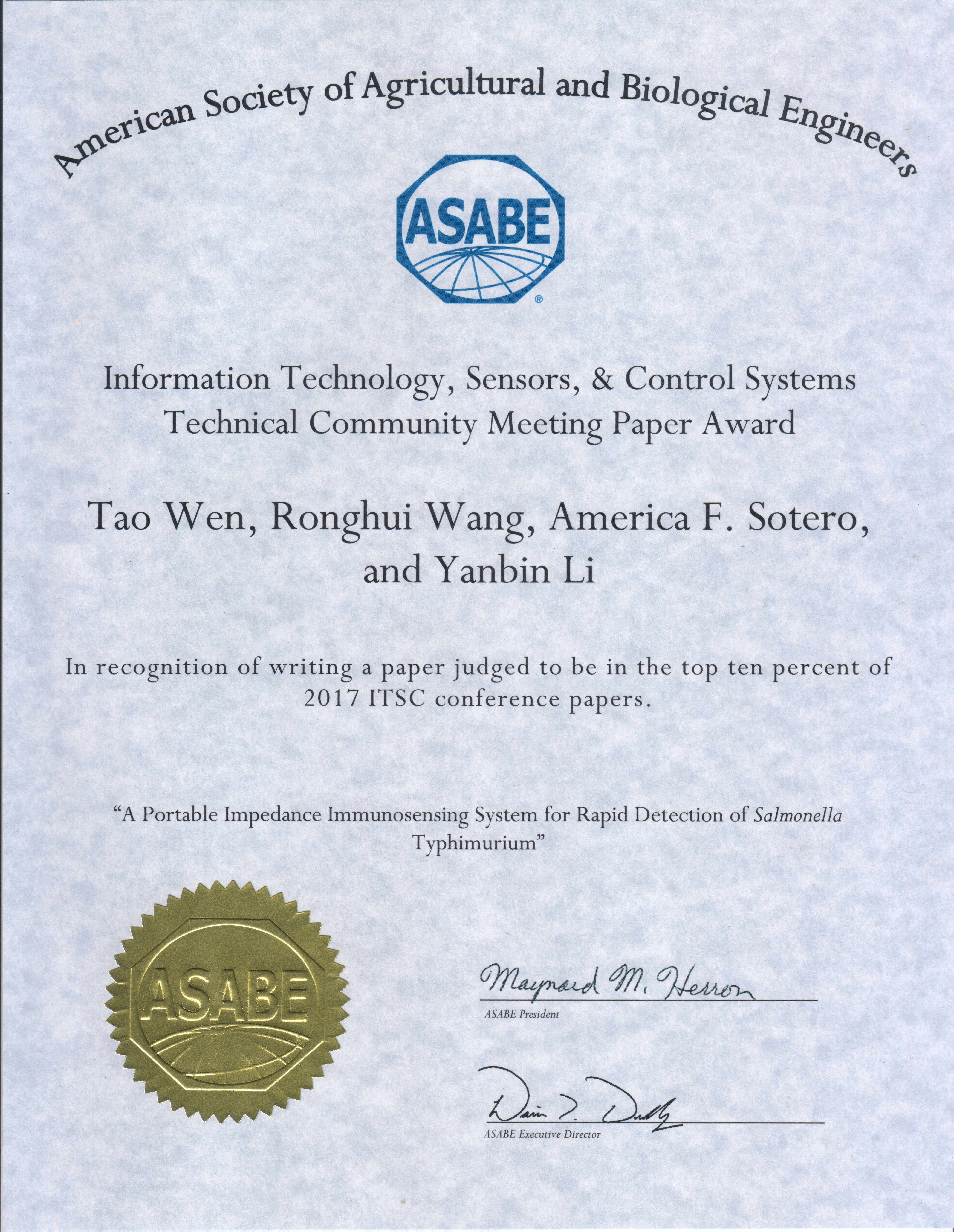 该报告研究成果,文韬博士以第一作者,中南林业科技大学以第一署名单位发表在2017 Annual International Meeting的论文荣获2017年美国农业与生物工程师学会信息分会优秀论文奖(ASABE/ITSC 2017 Meeting Paper Award),并受邀于2017 ASABE国际学术会议开幕式领奖。该奖项是从每年发表至ASABE会议论文中评选,今年ITSC (Information Technology, Sensors,& Control Systems Technical Community) 领域只评选出2篇论文被授予该荣誉,该论文为其中1篇,此奖项进一步提升了中南林业科技大学在ASABE及国内外农业与生物工程领域中的影响力。