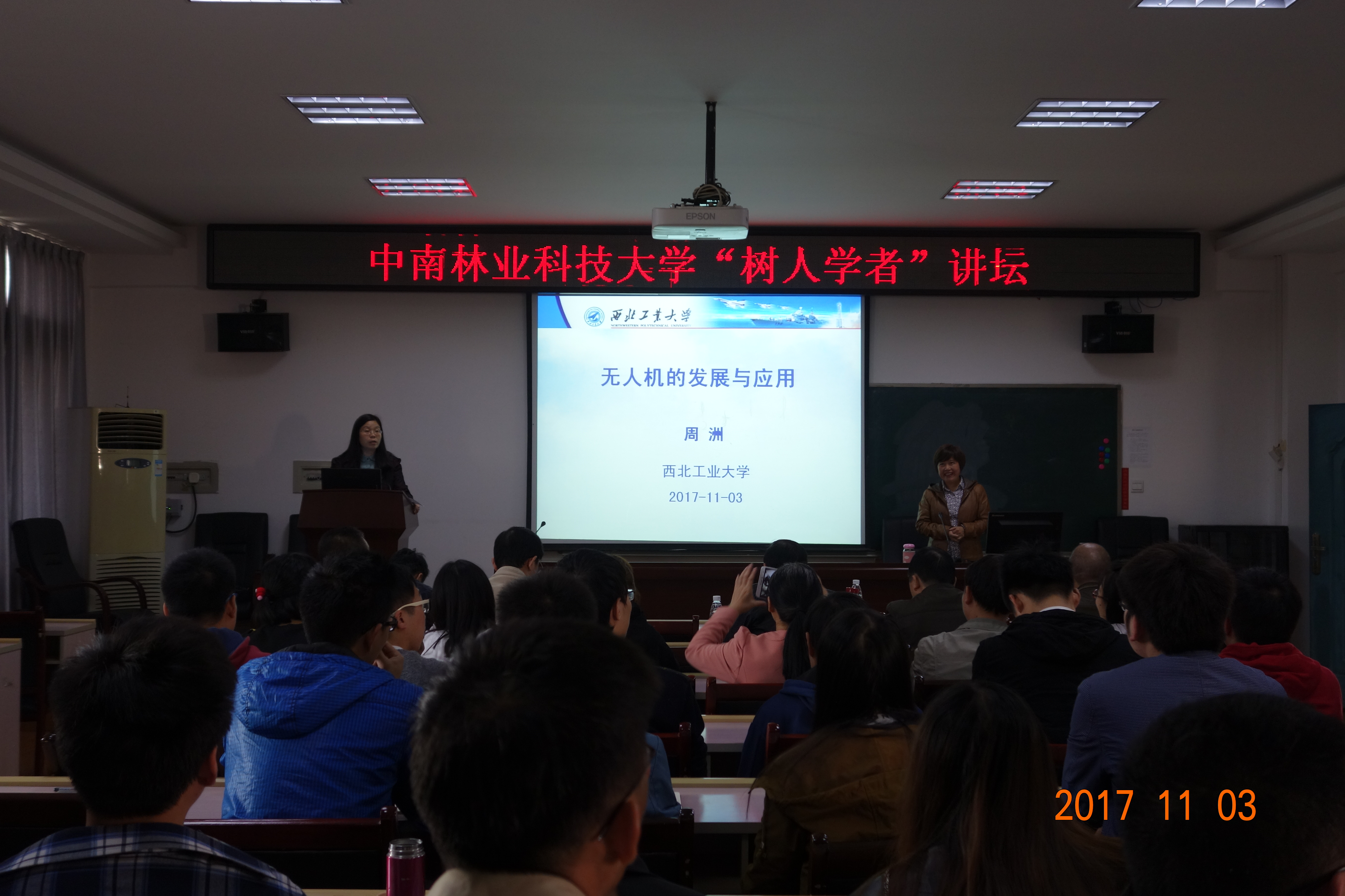 11月3日上午,西北工业大学周洲教授应邀在中南林业科技大学“树人学者”讲坛上作了题为“无人机的发展与应用”的主题学术报告。报告会由机电工程学院院长李立君教授主持,机电工程学院教师和研究生、本科生到场聆听。