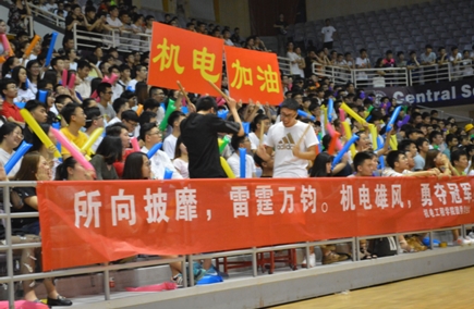 比赛还未开始,各啦啦队带来啦啦舞火爆全场,为比赛营造气氛,两方的观众不断给己方队员加油鼓劲,场中队员也被激动的情绪感染。冠军争夺赛的比赛一开始,机信学院队员就势如破竹,率先夺得4分,机电学院不甘示弱,稍作调整之后进攻有所起色,频频发起反扑。第一节比赛结束,计信学院以13:11领先2分。短暂的休息之后,第二节比赛开始,计信学院率先取得两分,机电学院则迅速抢夺球权,同样以两分回敬。双方你来我往,在本节中都展现出不俗的实力,双方战成24:27,机电工程学院暂时落后3分。
