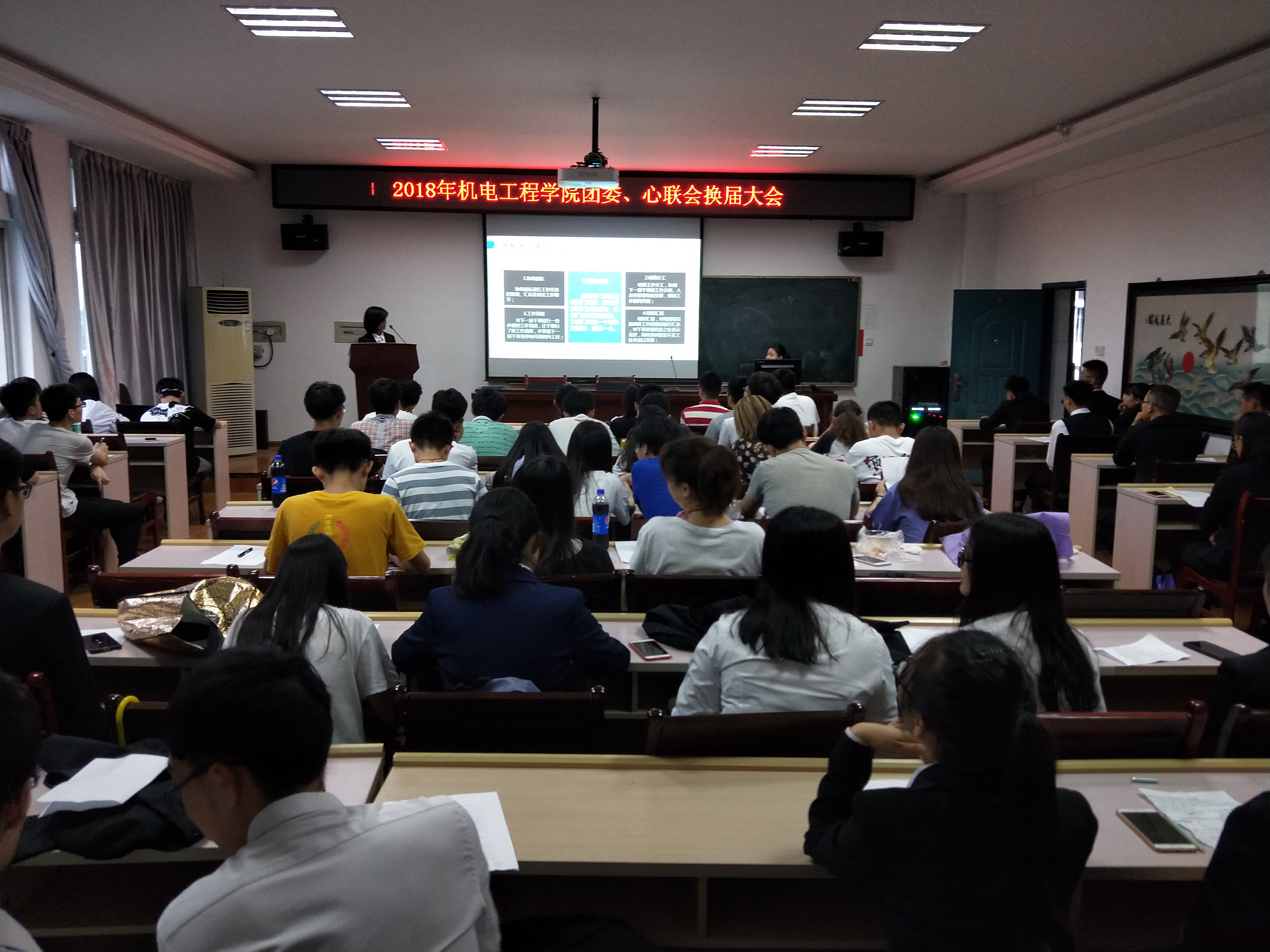 机电工程学院分别于6月19、20日晚六点半在逸夫楼633报告厅举办2018年学生会及团委、心联会副部换届大会,本次会议由我院党委副书记蒋炳春、学工办全体辅导员老师出席,第14届团委学生会、17级各班班长团支书参加。会议分别由14届团委学生会挂职主席胡思、14届团委学生会挂职常务副主席程楷智主持。