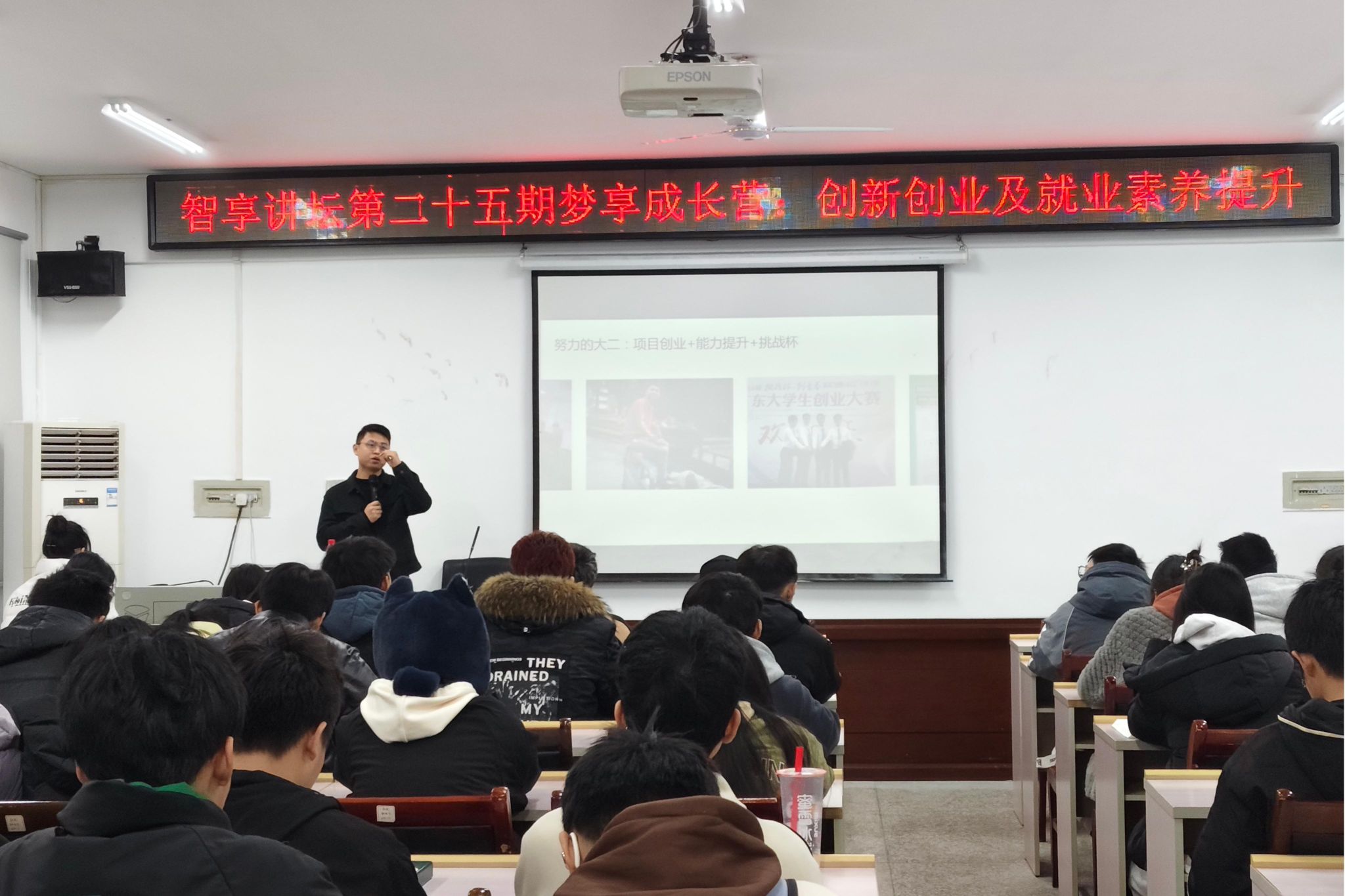 2024年12月20日晚,机械与智能制造学院在逸夫楼333举办了以“创新创业及就业素养提升”为主题的智享讲坛第二十五期梦享成长营。本次活动的主讲嘉宾为黄天磊老师,湖南坤晟科技有限公司CEO、长沙新生派网络科技有限公司总经理,湖南省教育厅大中专就业指导中心创业导师,湖南师范大学、湖南农业大学、长沙大学创新创业导师。