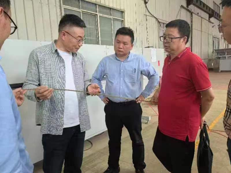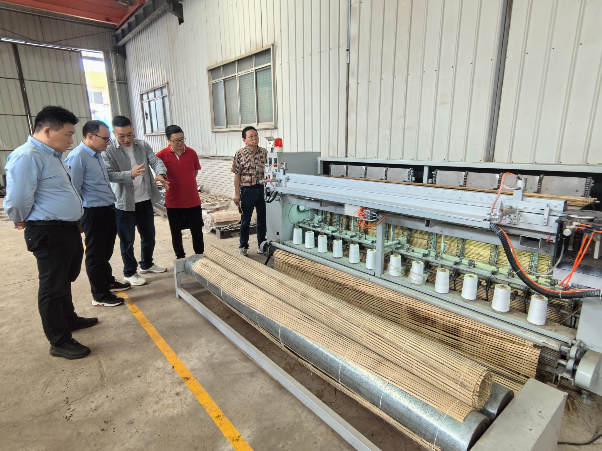 长沙小牛科技有限公司总经理何林对我院教师来访表示热烈欢迎。他详细介绍了公司发展历程,他指出,公司致力于原创技术及其产品研发,已具有多项自主知识产权的创新技术产品,尤其是研发成功的全自动等厚径向切篾缝帘一体机,在竹产业智能装备中处世界领先水平。文韬对小牛科技公司热忱接待表示感谢,对公司在竹材加工领域取得的成绩表示赞许,并希望双方能优势互补,在智能竹材加工装备方面开展深入的合作。随后,双方一起深入车间进行了技术探讨交流。