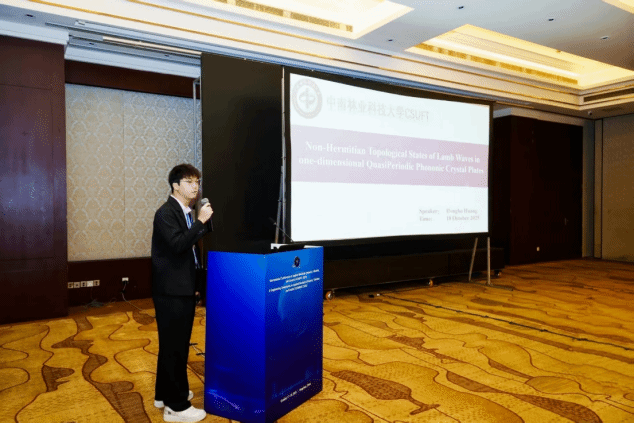 我院青年教师黄宏波应邀参加会议,并作主题为《Non-Hermitian Topological States of elastic Waves in QuasiPeriodic Phononic Crystal》(准周期声子晶体中弹性波的非厄米拓扑态研究)的学术报告。报告系统介绍了一维与二维非厄米准周期声子晶体中弹性波拓扑态的调控方法,揭示了其与传统周期结构不同的奇异拓扑现象,引起了与会学者的广泛关注与热烈讨论。此次参会不仅展现了我院青年教师在力学超材料与智能传感研究领域的前沿探索能力,也进一步提升了我院在应用动力学与控制领域的学术影响力。
