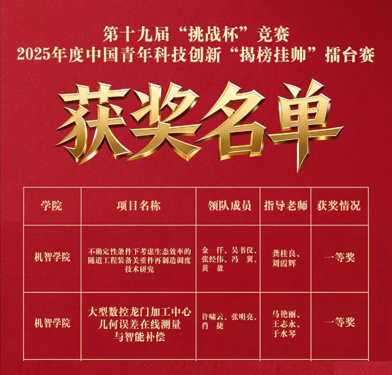 2025年10月14日,由共青团中央等主办的“挑战杯”揭榜挂帅专项赛暨2025年度中国青年科技创新“揭榜挂帅”擂台赛高端装备制造领域主擂台赛在长沙成功举行。中南林业科技大学机械与智能制造学院参赛团队凭借扎实的科研素养与卓越的创新能力脱颖而出,一举斩获两项全国一等奖。