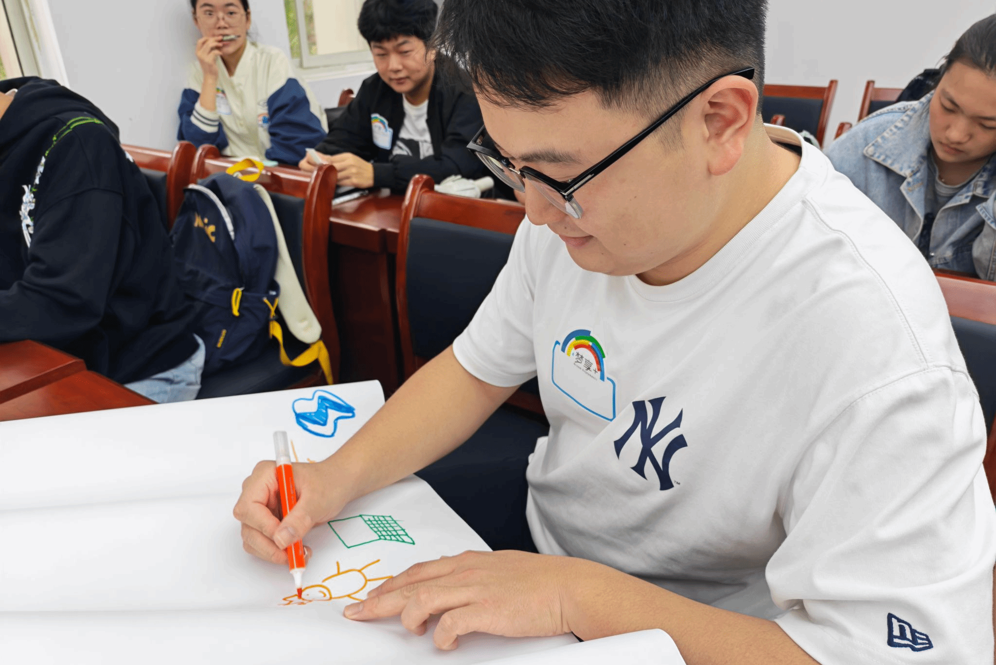 培训围绕“串串达人”“添添向上”“侃侃而谈”三个团辅环节展开。“串串达人”通过连环自我介绍,促进学委相互了解、发现志同道合的伙伴,增强团队认同感;“添添向上”引导学委在绘画中添加积极元素,体验情绪转化与正能量传递,提升心理调适能力;“侃侃而谈”围绕课堂管理、成长发展、学业帮扶、意识提升四大主题展开小组研讨与汇报,学院辅导员刘助旺、谌晶晶、陈燕洁分别进行点评指导,共同探索学风建设新路径。