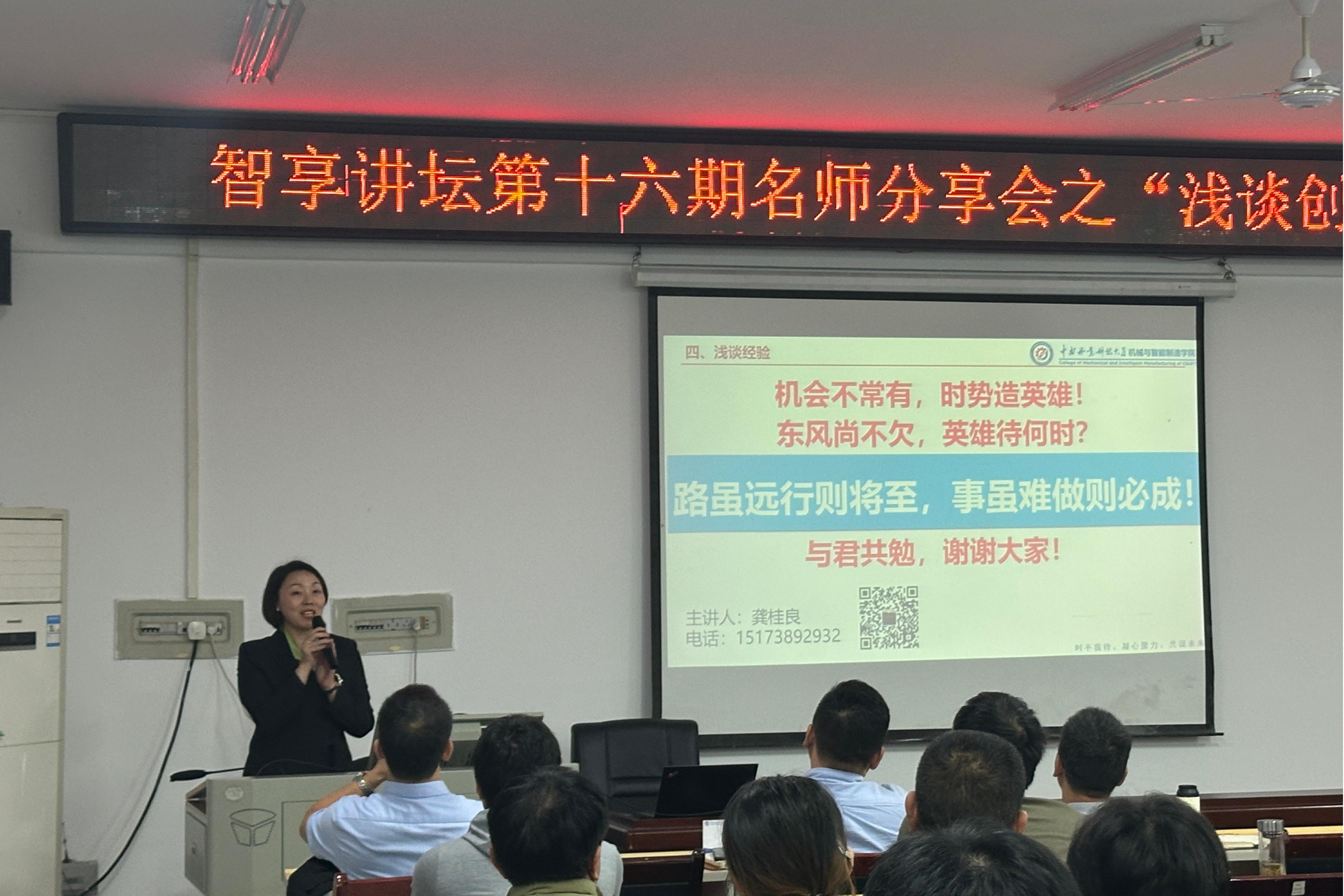 2024年11月11日晚,机械与智能制造学院在逸夫楼333会议室举办智享讲坛第十六期之名师分享会活动:浅谈创新创业。本次分享会由学院副院长龚桂良主讲,学院党委副书记徐钰婷主持,学院党委书记李红军、副院长(主持工作)文韬、教师代表、学生代表与会。
