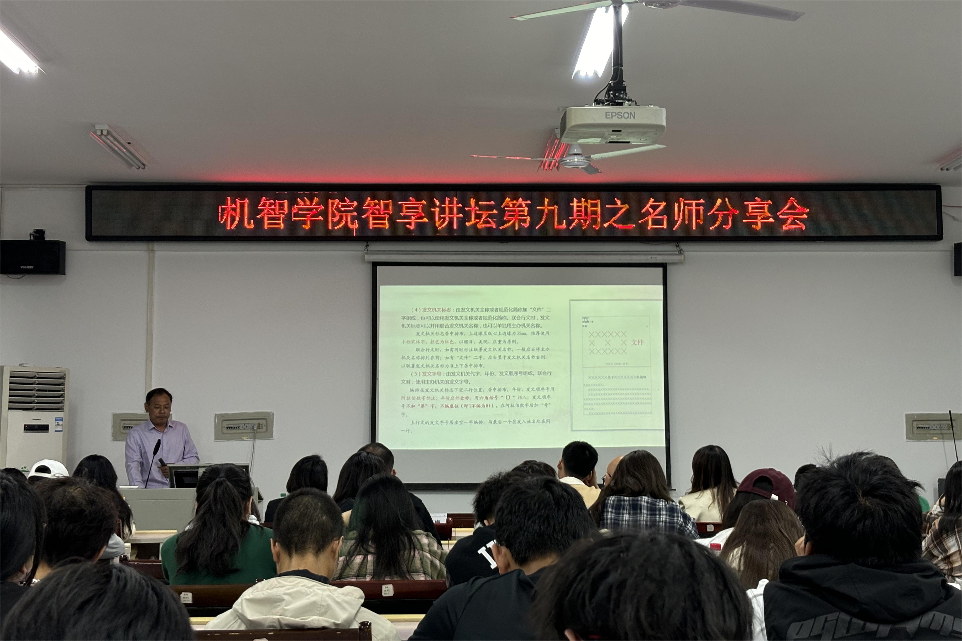 2024年10月8日晚,机械与智能制造学院在逸夫楼333召开智享讲坛第九期之名师分享会——公文处理基本知识讲座,学院原党委书记陈鹤梅受邀主讲。学院党委副书记徐钰婷、辅导员和学生代表参加,讲座由徐钰婷主持。