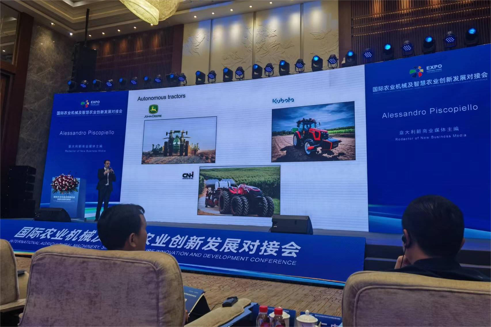 此次对接会,来自中意两国政商学界的近百位嘉宾齐聚一堂,共同听取了全球农业机械发展概况、无人化智慧农场关键技术与实践、机器人和人工智能-农业的未来等专题报告。中联农业机械、湖南农夫机电、长沙桑铼特等省内知名农机企业推介了最新研发机具。会议期间,学院教师与与会专家进行了深入交流,并分享了学院在农林领域的最新研究成果及未来规划。