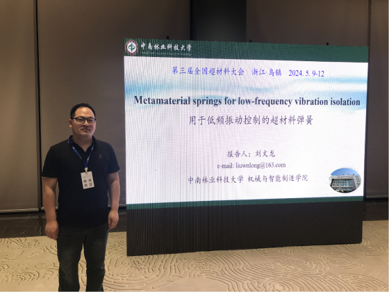 本次大会我院青年教师刘文龙参加会议,并作题为《Metamaterial springs for low-frequency vibration isolation》的学术报告,报告展示了低频振动控制现状,分析了传统弹簧元件在低频振动控制中面临的困境,介绍了准零刚度低频隔振技术,并提出了具有准零刚度特征的超材料弹簧新概念,有望拓展传统弹簧元件类型、为解决困扰被动隔振领域多年的难题提供了理论参考。