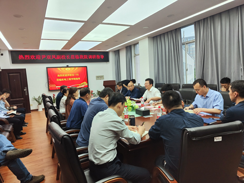 为落实学校党委大兴调查研究的实施方案,以主题教育走深走实助推学校科技工作高质量发展,5月6日上午,副校长尹双凤率队来学院调研。科技处处长周文化、人事处副处长何晓东、研究生院副院长邝祝芳、科技处副处长乔建政,科技成果及知识产权管理科科长陈伟陪同调研,机电工程学院党政班子成员、系部主任、青年教师代表等20余人参加调研座谈会。